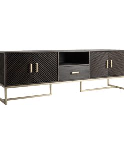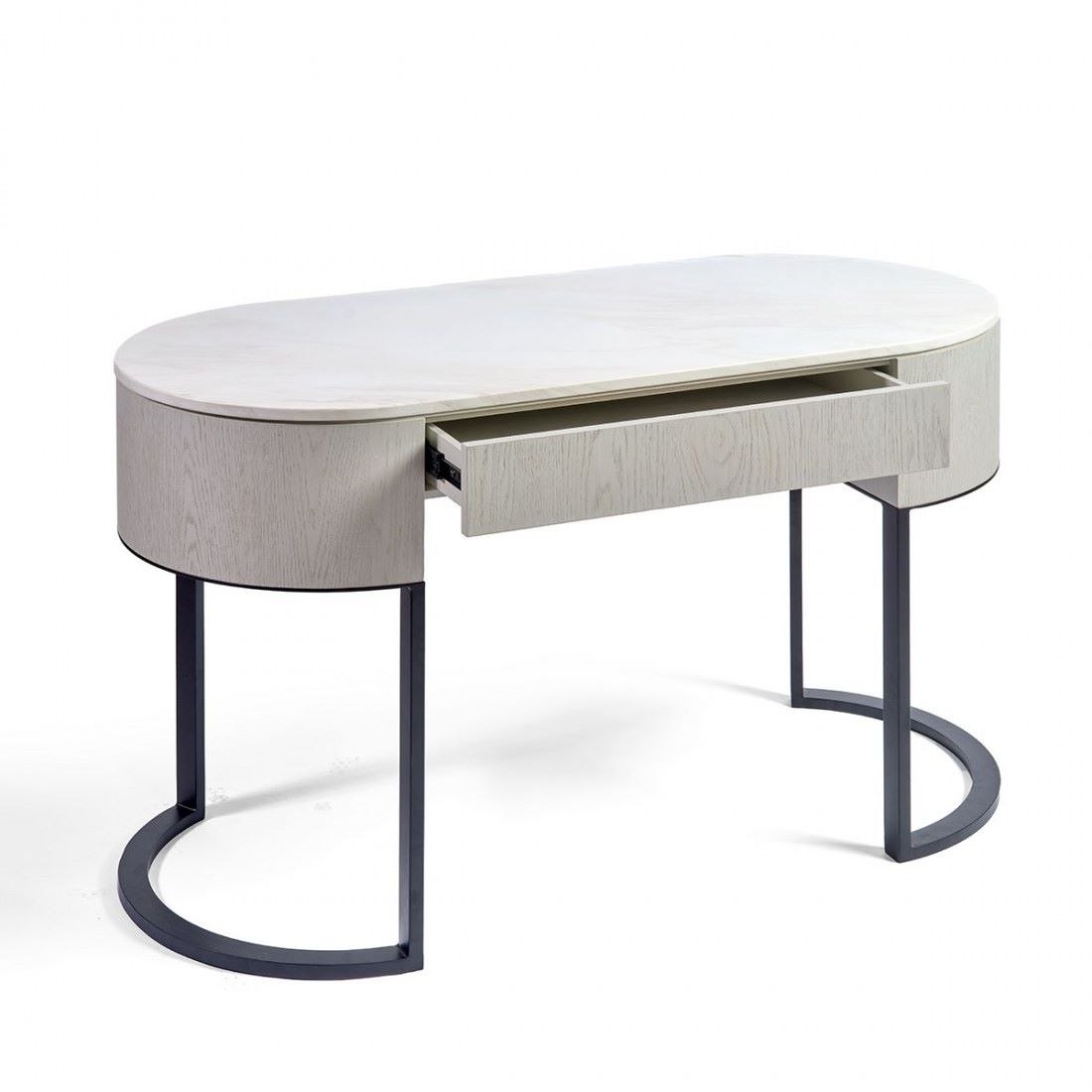 Consola elegante de forma ovalada, fabricada en roble claro con tapa de piedra natural y patas metálicas negras. Sofisticación y funcionalidad para cualquier espacio.