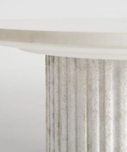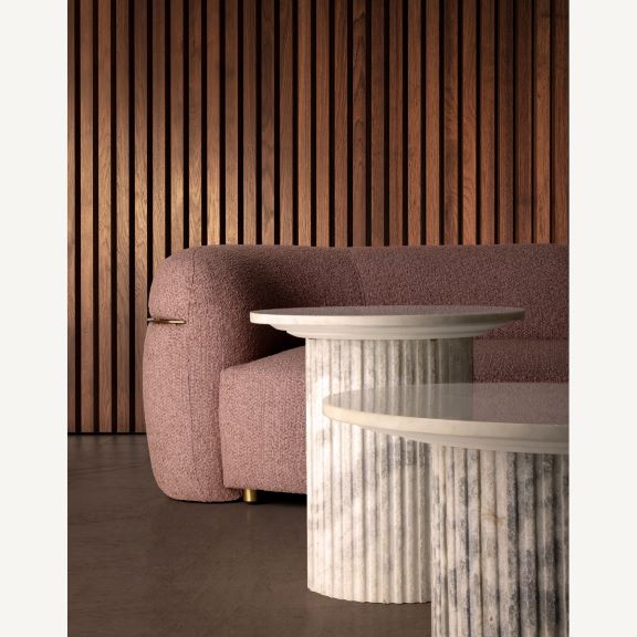 Diseñada para aportar presencia y sutileza a partes iguales, esta mesa de centro redonda destaca por su imponente base estriada en forma de columna, inspirada en los cánones clásicos de la arquitectura. El sobre, realizado íntegramente en mármol blanco natural, exhibe una superficie levemente satinada que resalta las vetas minerales y convierte cada pieza en un objeto único.